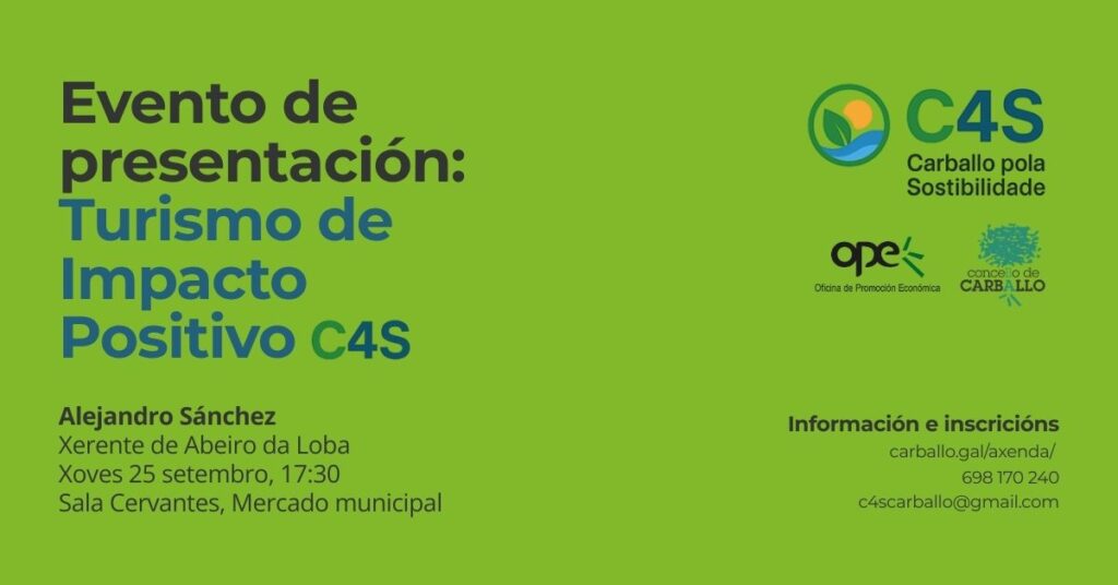 O Concello de Carballo presenta o novo programa gratuíto C4S – Carballo pola Sostibilidade, unha iniciativa que busca facilitar e impulsar a integración da sostibilidade como factor diferencial e competitivo do turismo local. “Co Programa C4S _explica o concelleiro de Promoción Económica e Turismo, Xosé Regueira, queremos que a sostibilidade se converta nun selo de […]