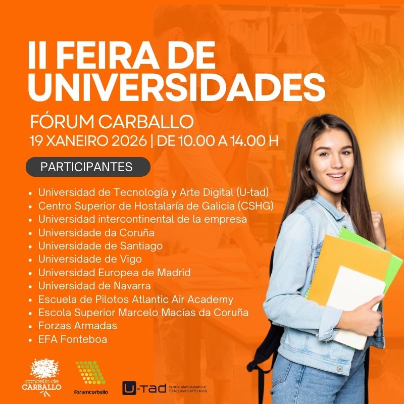 O Concello de Carballo, a través das concellarías de Educación e Innovación, Formación e Emprego, participa nesta iniciativa, promovida pola U-tad (Universidad de tecnología y arte digital), que será un dos centros participantes xunto coa UDC (Universidade da Coruña), USC (Universidade de Santiago de Compostela), Uvigo (Universidade de Vigo), Universidad Europea de Madrid, CSHG (Centro Superior de Hostalaría de Galicia), Escuela de Pilotos Atlantic Air Academy, Escola Superior Marcelo Macías da Coruña, Universidad de Navarra, Universidad intercontinental de la empresa, EFA Fonteboa e Forzas Armadas.