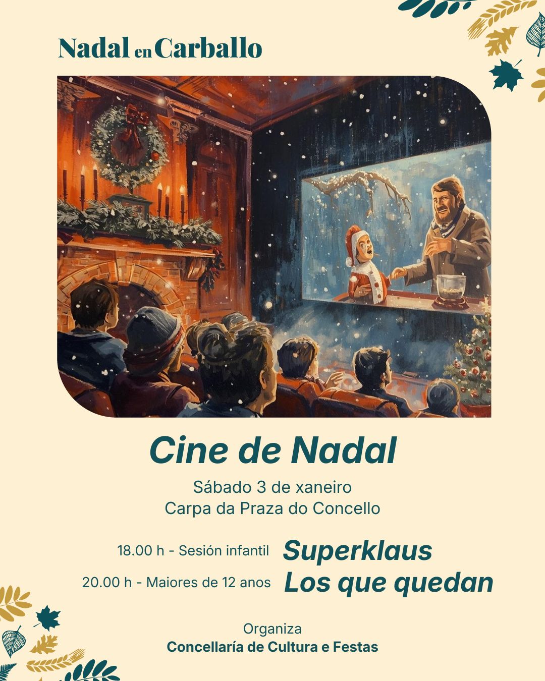 Este ano, a Concellaría de Cultura e Festas convídate a gozar da maxia do cinema tamén no Nadal. O sábado 3 de xaneiro converteremos a carpa da Praza do Concello nunha gran sala de cine na que peques e maiores poderán desfrutar da sétima arte. E ademais teremos no exterior un posto ambulante para que poidades mercar flocos de millo, chuches… Ao cine convidamos nós. Este é o plan: