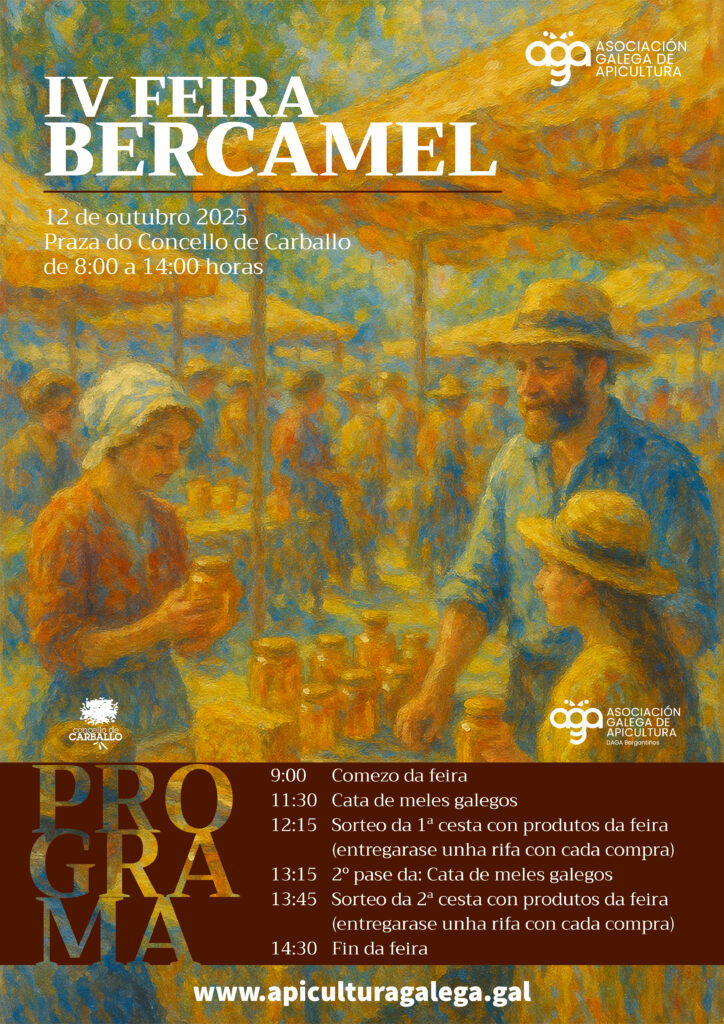 A feira do mel está organizada un ano máis pola Asociación Galega de Apicultores coa colaboración da Concellaría de Feiras e Mercados. Segundo explica o delegado de AGA na comarca, o carballés Víctor Tasende, desde as 09.00 ata as 14.30 horas, todas as persoas que se acheguen ata os postos de Bercamel descubrirán un amplo abano de produtos elaborados con mel, e este ano, ademais, poderán saborealos, porque haberá dúas catas de meles galegos ás 11.30 e ás 13.15 horas.