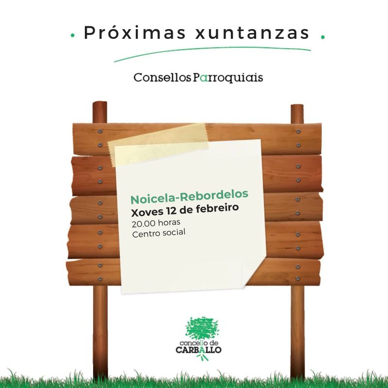 O consello parroquial de Noicela-Rebordelos celebra a súa xuntanza anual no centro social de Imende. Na sesión, aberta a toda a veciñanza, participarán o alcalde, Daniel Pérez, e representantes dos grupos políticos municipais, así coma do movemento asociativo da parroquia. As persoas que o desexen poden asistir a título individual.