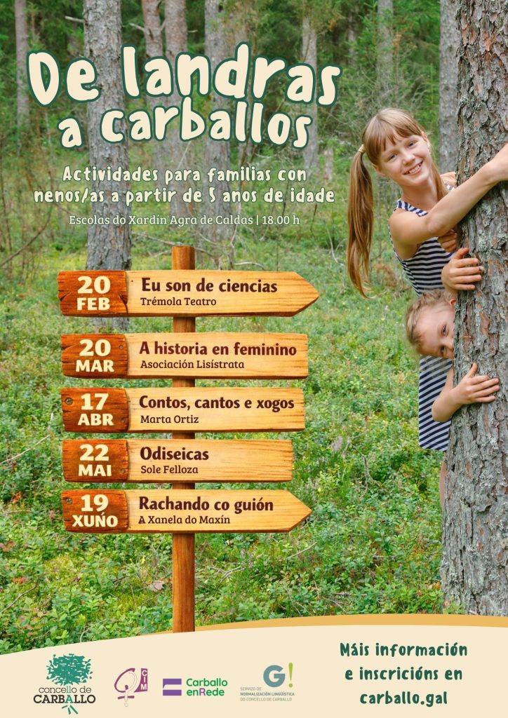 As concellarías de Igualdade e Normalización Lingüística presentan a nova edición do programa De landras a carballos, unha iniciativa pensada para reunir actividades culturais, educativas e lúdicas dirixidas ás familias e a infancia na fase entre os 5 e os 11 anos. O ciclo estenderase de febreiro a xuño, e desenvolverase nas Escolas do Xardín Agra de Caldas, sempre ás 18.00 horas.