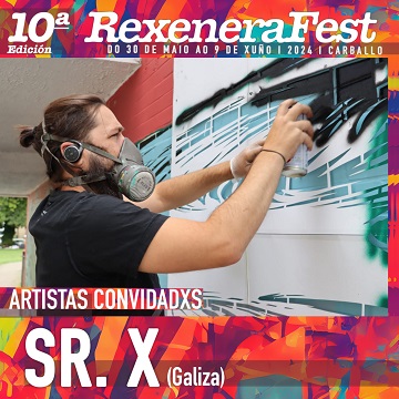 Sr. X é un artista urbano galego afincado en Londres e unha figura referencial en Europa da arte urbana feita a través da técnica do stencil. Algúns dos seus temas preferidos son a cultura pop, o cinema, a publicidade e as lendas urbanas. As súas creacións a miúdo están envoltas nun distintivo velo de ironía, retranca e crítica social, sempre aliñadas cun característico humor ácido e sarcástico. Podedes botar un ollo ao seu traballo aquí: https://sr-x.com Para velo en acción só terás que achegarte ata a rúa Ponte 11 a partir do domingo 2.