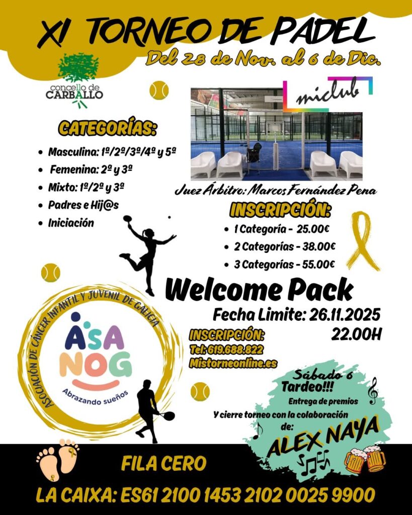 O torneo solidario de pádel Concello de Carballo, organizado por Miclub Pádel a beneficio de Asanog, cumpre onde anos. Ao longo deste tempo foi indo a máis en todos os sentidos, tanto en canto á participación coma en categorías ou en colaboración, e este ano agardamos volver a contar coa mesma solidariedade de sempre ou aínda máis, xa que os donativos recibidos ata hoxe superan os 2.000 euros grazas, sobre todo, á colaboración do tecido empresarial carballés.
